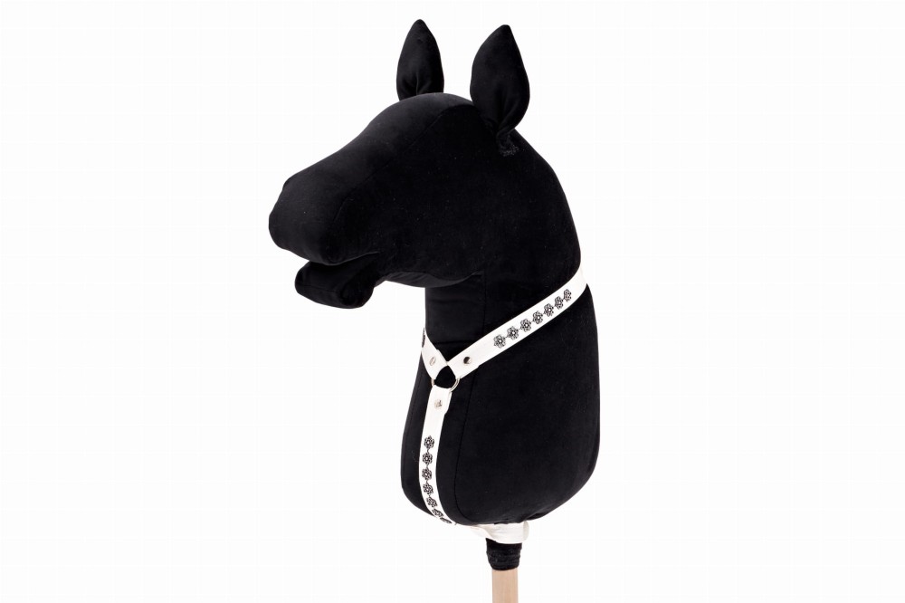 Napierśnik wykonany z taśmy ekoskóry o szerokości 15 mm - kolor biały. Posiada regulację na szyi hobby horsa. Ozdobiony czarno- srebrnymi cyrkoniami -kwiatuszki.