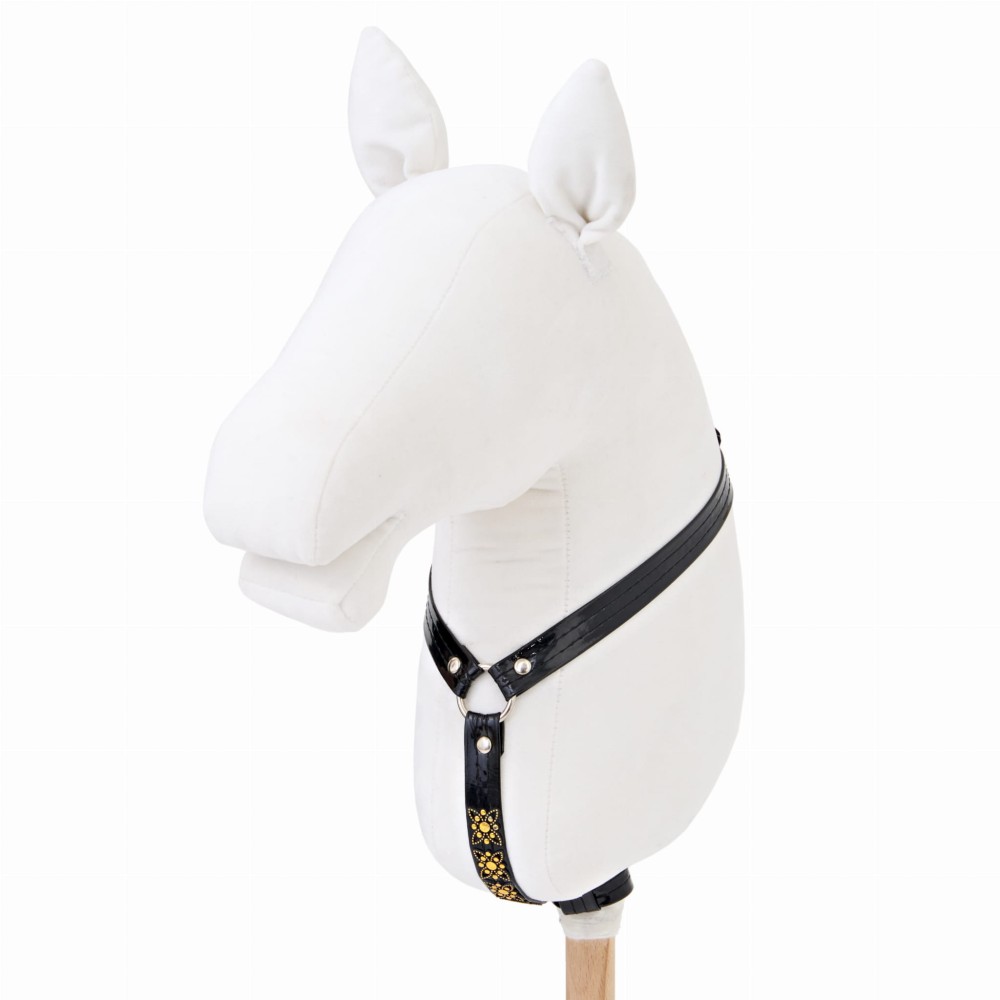 Napierśnik wykonany z taśmy ekoskóry lakierowanej o szerokości 15 mm - kolor czarny. Posiada regulację na szyi hobby horsa. Ozdobiony czarno- złotymi cyrkoniami.
