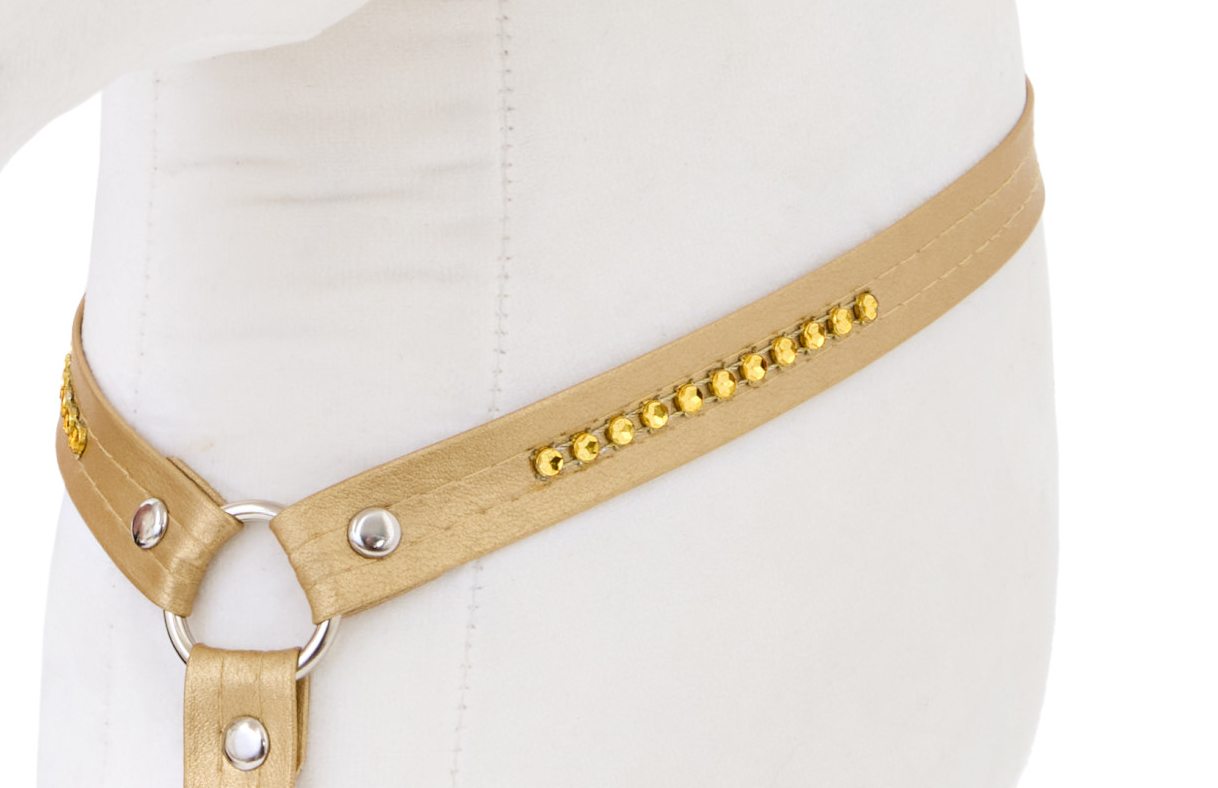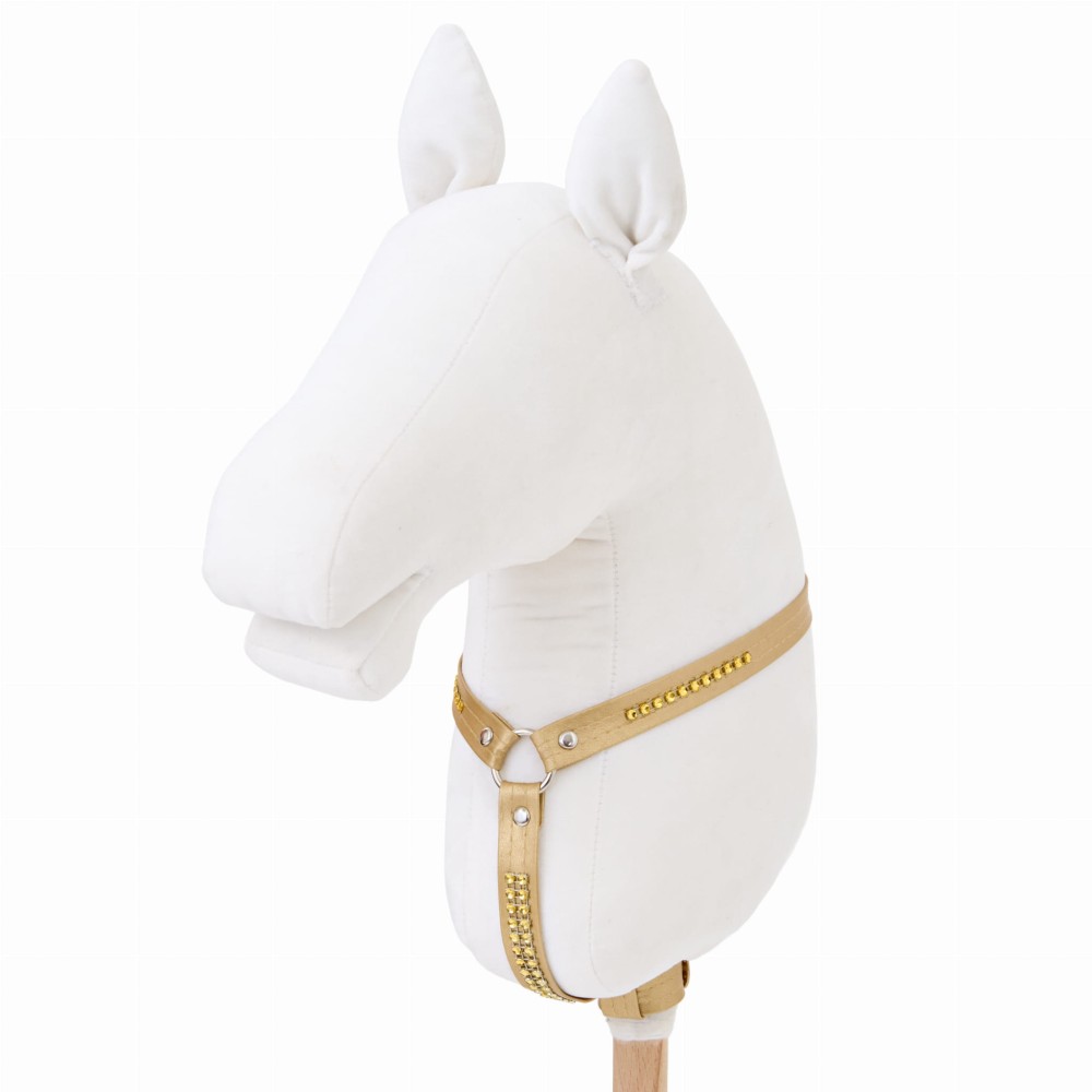 Napierśnik wykonany z taśmy ekoskóry o szerokości 15 mm - kolor złoty. Posiada regulację na szyi hobby horsa. Ozdobiony złotymi cyrkoniami.