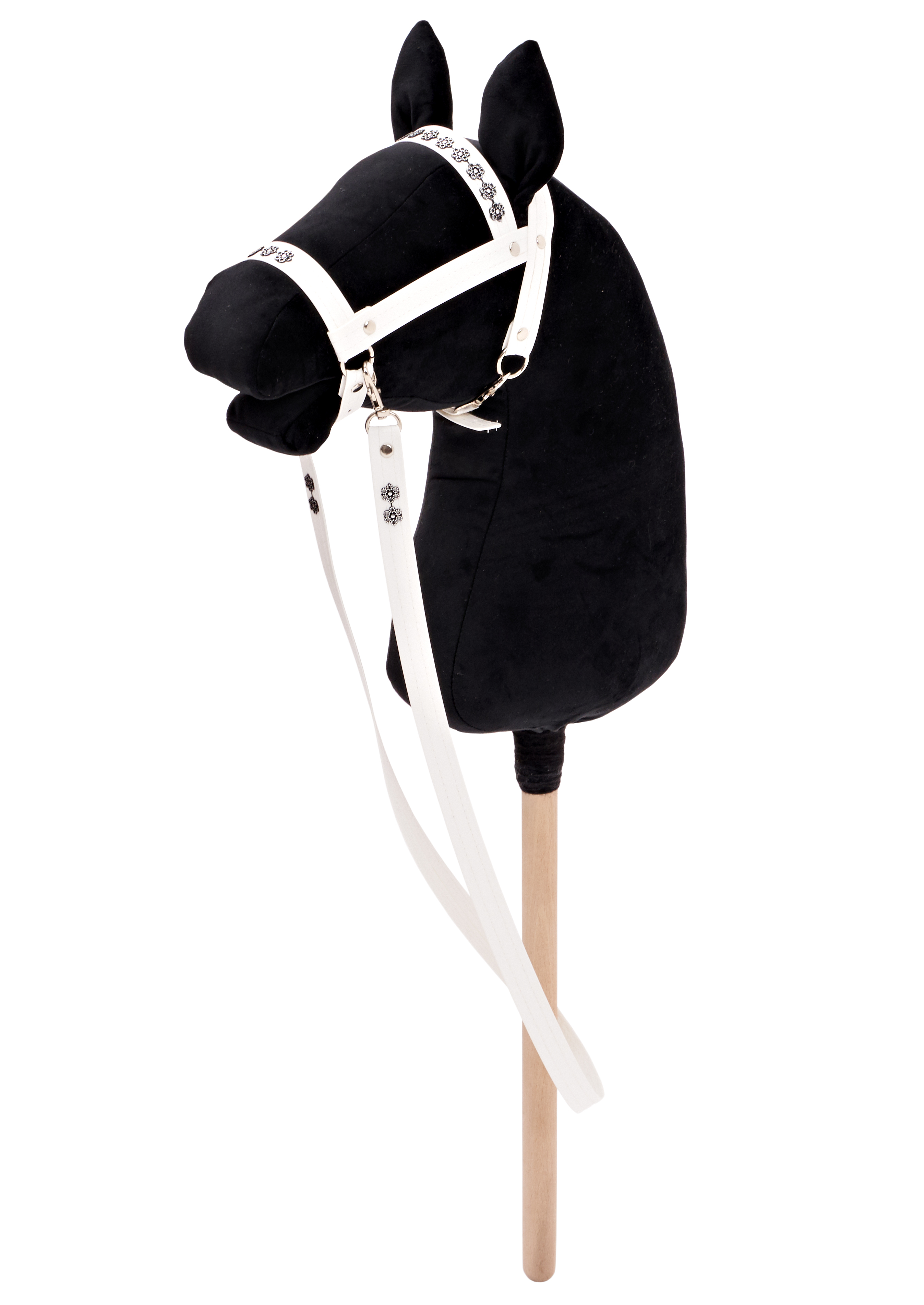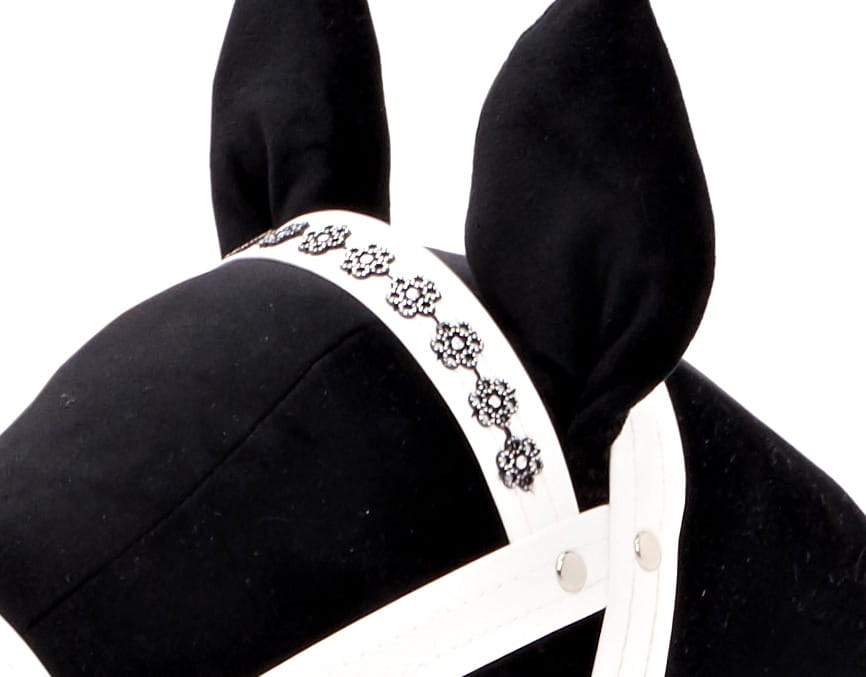 Ogłowie regulowane koloru białego wykonane z taśmy z ekoskóry w komplecie z wodzami, ozdobione cyrkoniami w kwiatki czarno- srebrne.