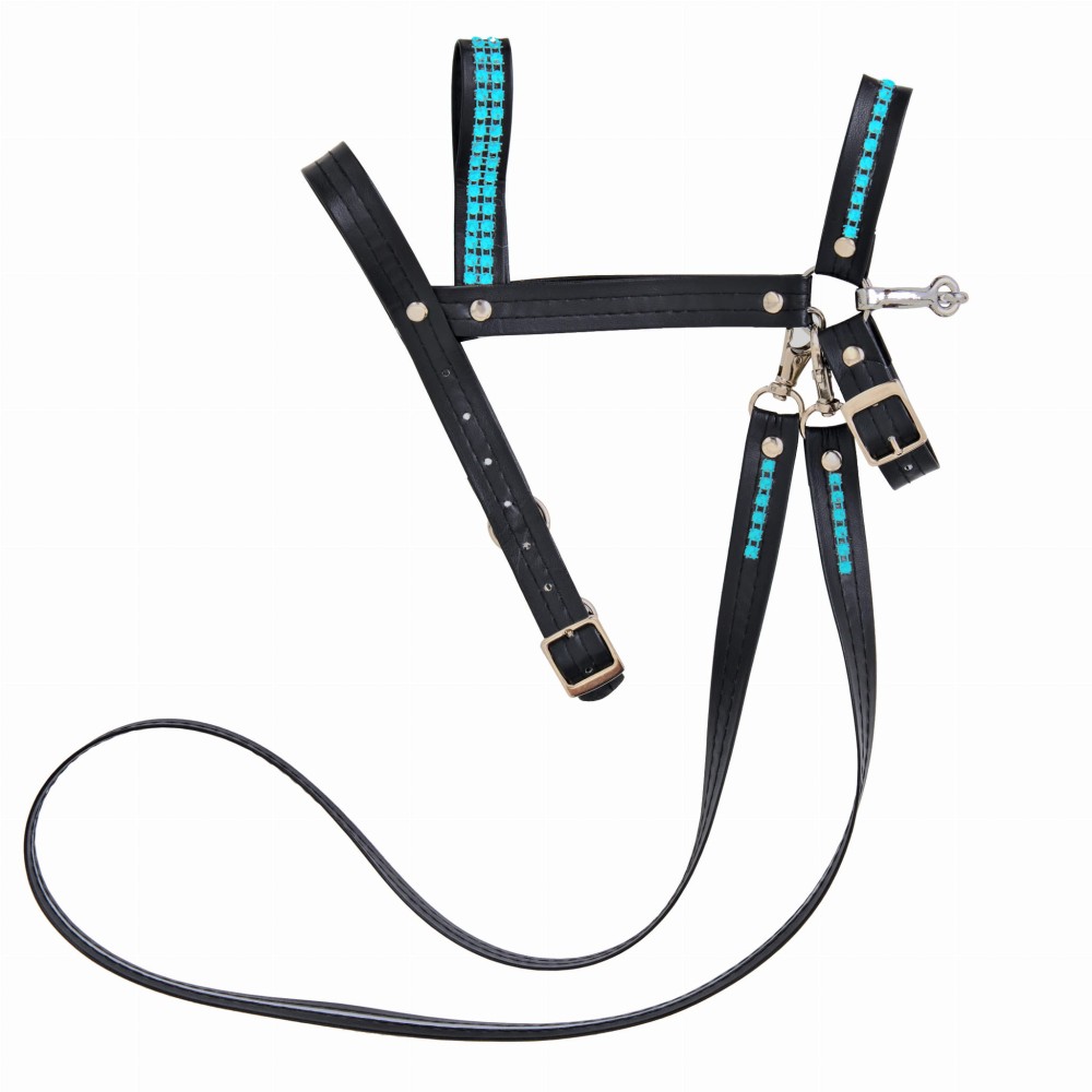 Ogłowie regulowane z wędzidłem wykonane z taśmy z ekoskóry w komplecie z wodzami, ozdobione cyrkoniami.
