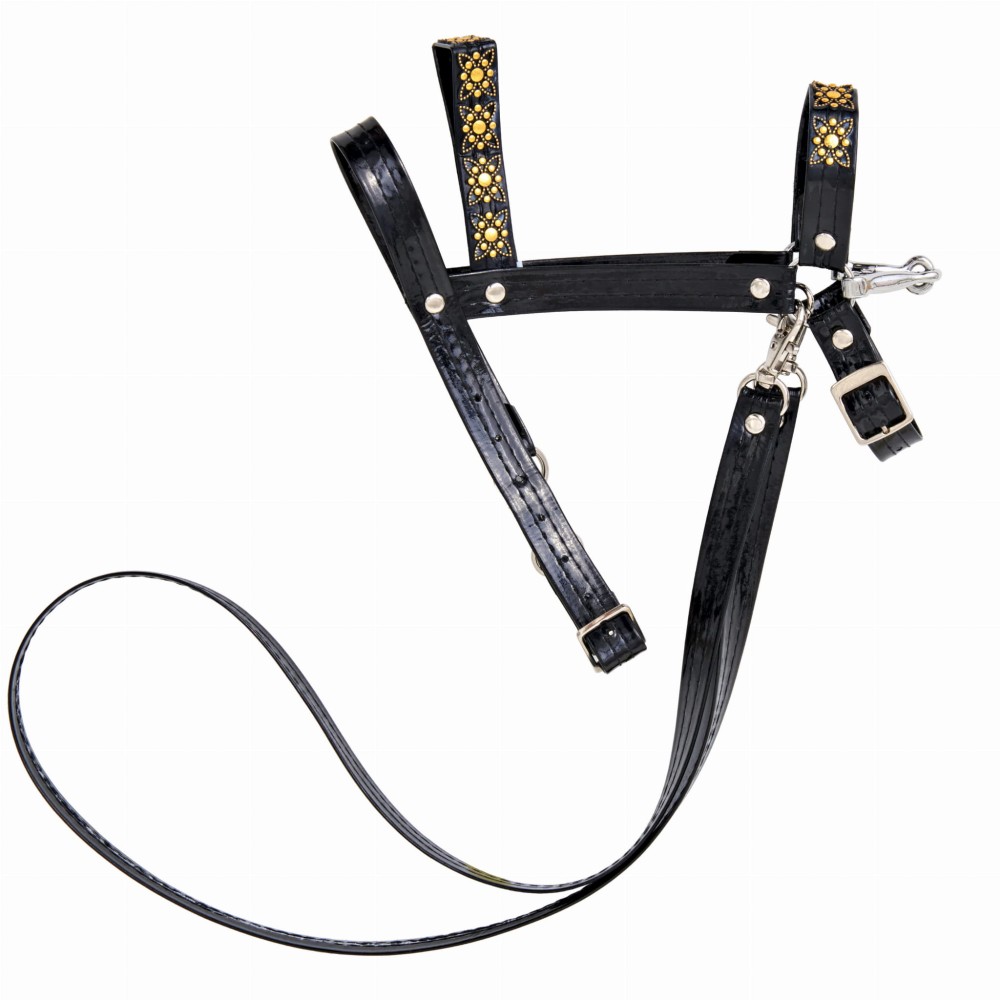 Ogłowie regulowane z wędzidłem wykonane z taśmy z ekoskóry w komplecie z wodzami, ozdobione cyrkoniami.