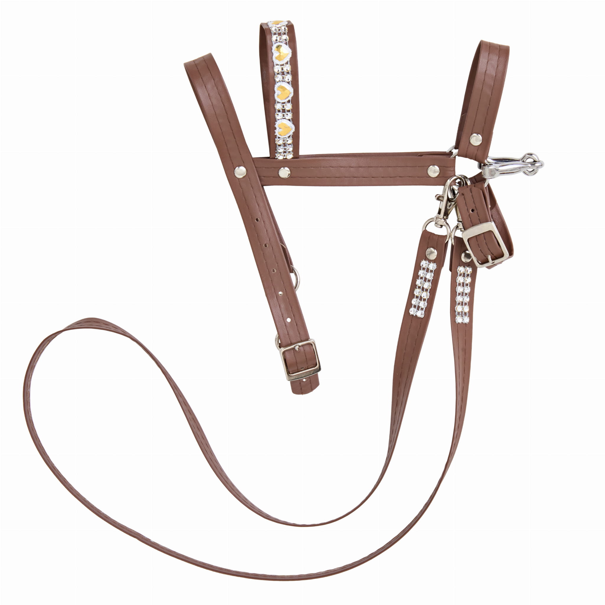 Ogłowie regulowane z wędzidłem wykonane z taśmy z ekoskóry w komplecie z wodzami, ozdobione cyrkoniami srebrno- złotymi w serca.