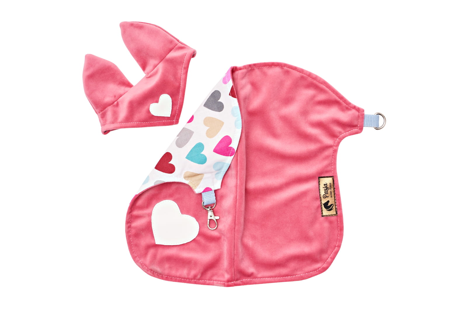 Derka wykonana z różowego materiału typu velvet , podszyta bawełniany materiałem w kolorowe serduszka . Elementem ozdobnym derki jest białe serce ekoskóry.