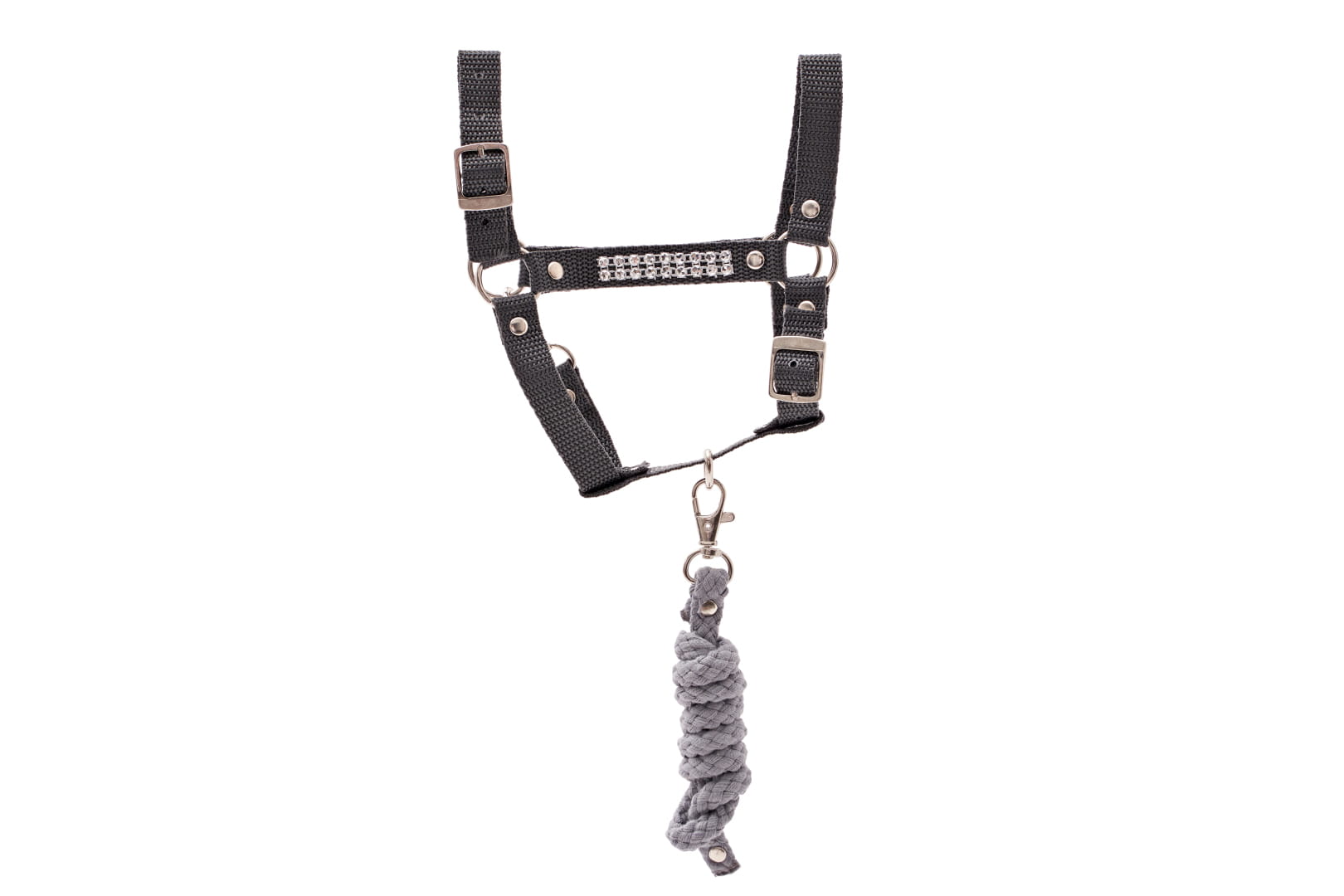 Wykonany z taśmy polipropylenowej, ozdobiony srebrnymi cyrkoniami. Regulowany dwupunktowo. Elementy metalowe wykonane ze stali nierdzewnej.